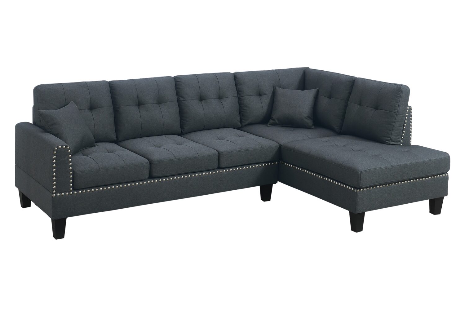 Both the seat and back cushions are tufted and fully removable, offering a tailored look with added flexibility for cleaning or rearranging. What sets this sectional apart is its attention to design details: the armrests are gracefully shaped in an oval curve, giving it a softer, inviting silhouette, and are outlined with classic nail head trim that continues across the front base for a cohesive, upscale touch. The subtle metallic accents create a timeless contrast against the upholstery, making the piece feel both refined and cozy. To complete the look, matching throw pillows are included, adding extra comfort and a coordinated finish that ties the entire piece together. Whether placed in a traditional or transitional living room, this sectional blends design and comfort to elevate your home.