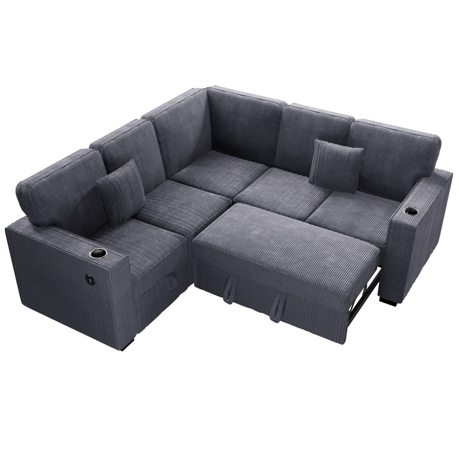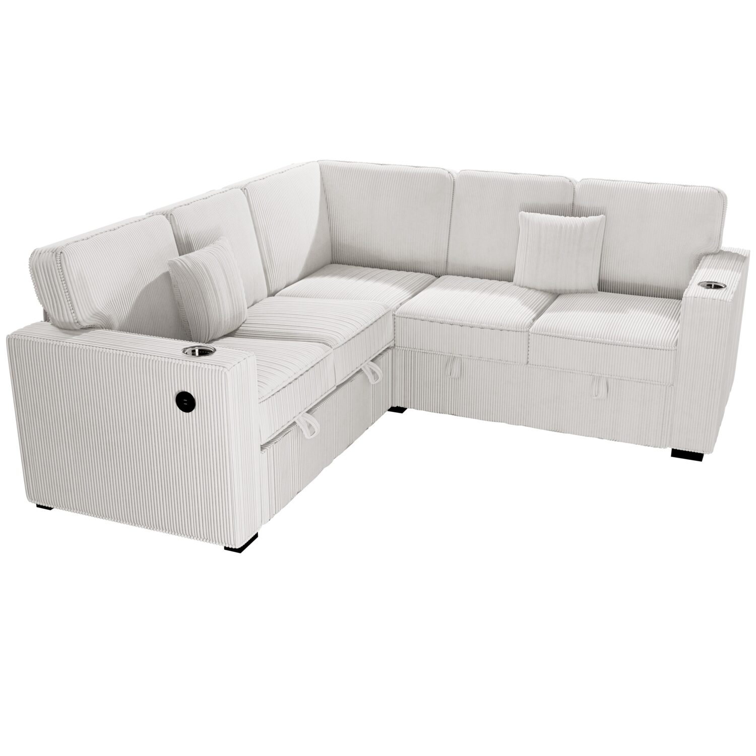 Both arms are equipped with built-in cup holders, ensuring your drinks stay secure, while one arm also boasts a handy USB port for effortless device charging. The two matching accent pillows add a touch of coordination to the overall look, while the low-profile legs give the sectional a modern, grounded appeal that complements contemporary décor. Comfortably seating up to four people, this sectional is the ideal centerpiece for any living room.
