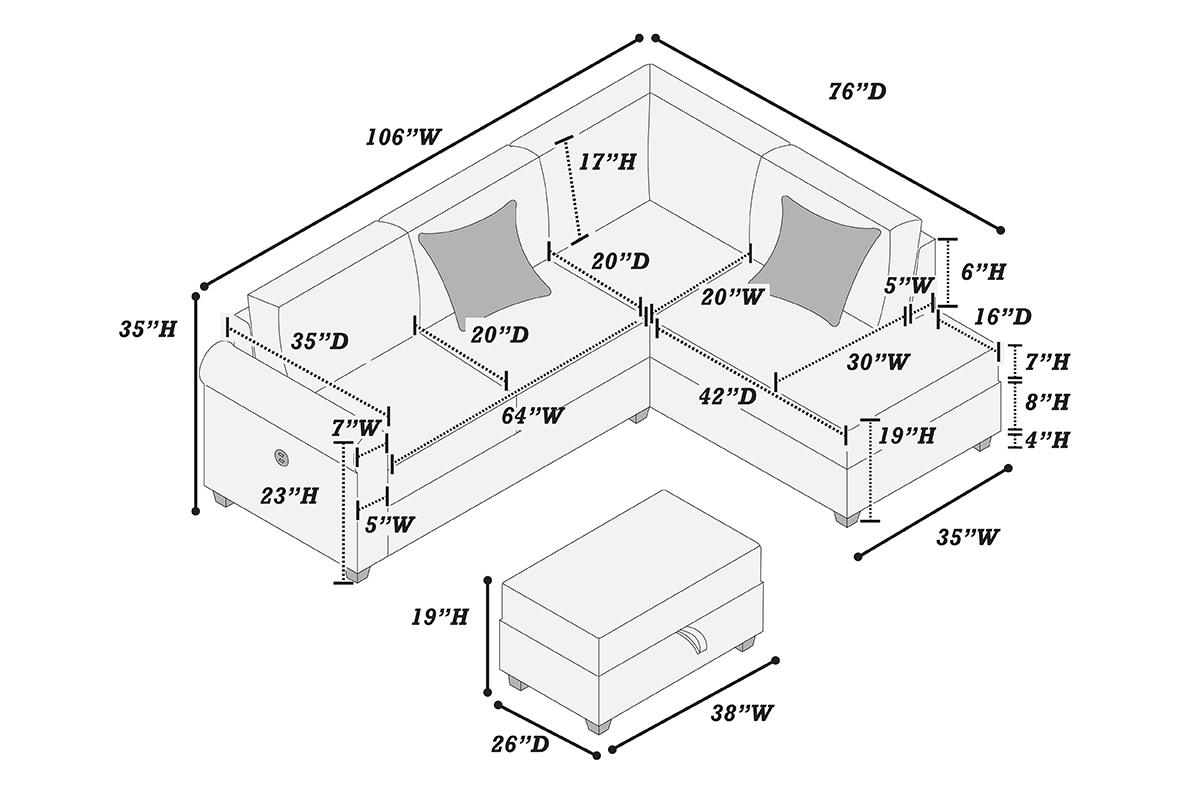 This 3-Piece Sectional Set is designed to redefine comfort and style in your living space. Experience convenience at your fingertips with the Left Arm Facing (LAF) Sofa, featuring a built-in USB port for easy charging of your devices. Sink into relaxation with the Right Arm Facing (RAF) Chaise, offering ample space to stretch out and unwind after a long day. Making it the perfect spot for lounging, reading, or simply enjoying your favorite movie. Maximize your living room storage with the included Storage Ottoman, perfect for stashing away blankets, magazines, or remote controls, it seamlessly blends style with functionality. Crafted with corduroy material soft to the touch and adds a touch of sophistication to your living space. Complete with two throw pillows, this 3-Piece Sectional Set is the epitome of modern elegance and comfort.