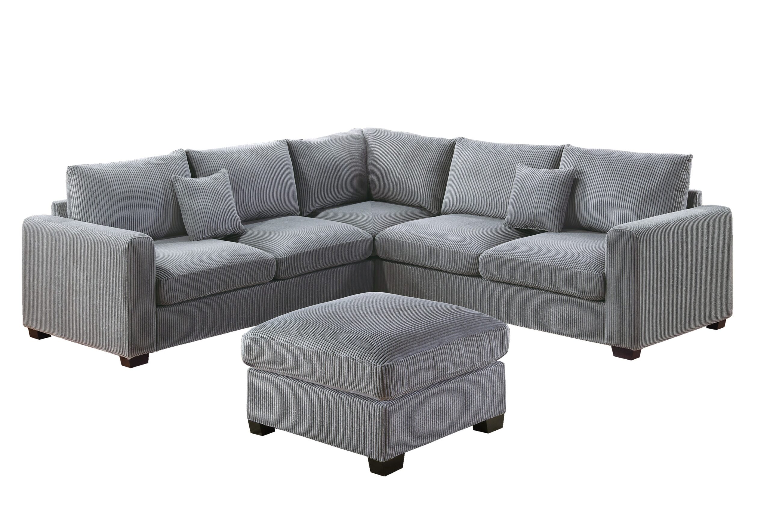 Transform your living space with the perfect blend of comfort and modern design. This 4-Piece Sectional Set with Ottoman brings a stylish and inviting feel to your home, offering ample seating for family and guests. Designed with an L-shaped orientation, this sectional effortlessly fits into a variety of room layouts while maximizing space and comfort. Upholstered in soft corduroy fabric, this sectional provides a plush and textured feel that enhances relaxation. The plush back cushions offer superior support, making this set an ideal spot for lounging, movie nights, or casual gatherings. The square-shaped arms add a structured and contemporary touch, complementing the sectional’s clean lines and sophisticated aesthetic. This set includes a right-arm-facing (RAF) and left-arm-facing (LAF) one-arm loveseat, offering spacious seating on both sides. A corner wedge connects the loveseats, creating a seamless and cozy seating arrangement. The ottoman completes the set, serving as a footrest, extra seating, or a convenient surface for trays and décor. Designed with low-profile legs, this sectional maintains a sleek and grounded look that complements modern and transitional interiors. The two matching throw pillows add a decorative and cozy touch, tying the whole set together effortlessly. This sectional set is perfect for creating an inviting and stylish gathering space in your home.