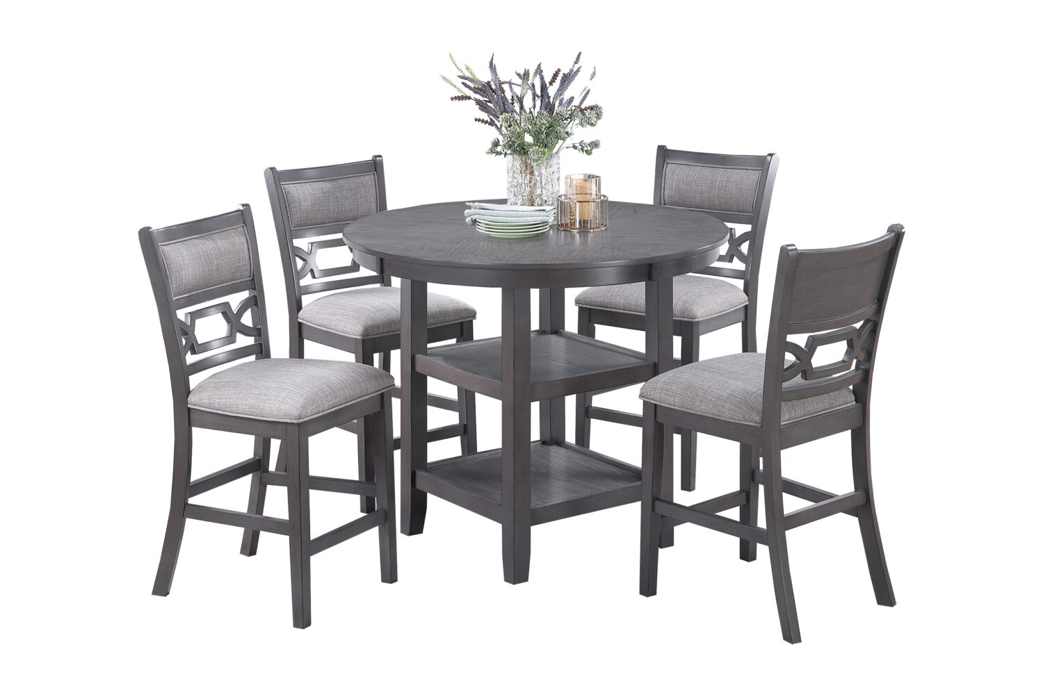 Its compact shape makes it ideal for smaller dining areas, breakfast nooks, or open-concept living spaces, while the built-in lower shelf offers extra functionality. Perfect for displaying decor, storing dishes, or keeping serving essentials within reach, these shelves make entertaining and casual meals more convenient and visually pleasing. Each of the four matching chairs is thoughtfully crafted to offer both comfort and support. The upholstered seats and backrests are covered in a soft, neutral fabric that complements the charcoal wood frame beautifully. Subtle curved back legs enhance comfort while adding to the set’s refined profile. Decorative open-back chair detailing adds visual interest and gives the set a touch of classic charm. This decorative back design features a symmetrical X-shaped motif intersecting a central medallion, framed by clean, rectangular borders. Whether you’re hosting weekend brunches or enjoying a quiet dinner at home, this 5-piece set provides a cozy and stylish place to gather. Its balanced blend of design, comfort, and utility makes it an easy choice for those looking to bring both function and beauty into their dining area.