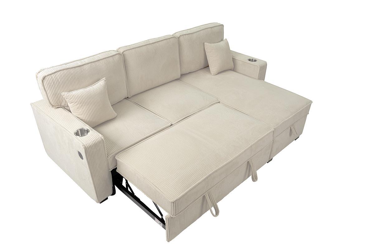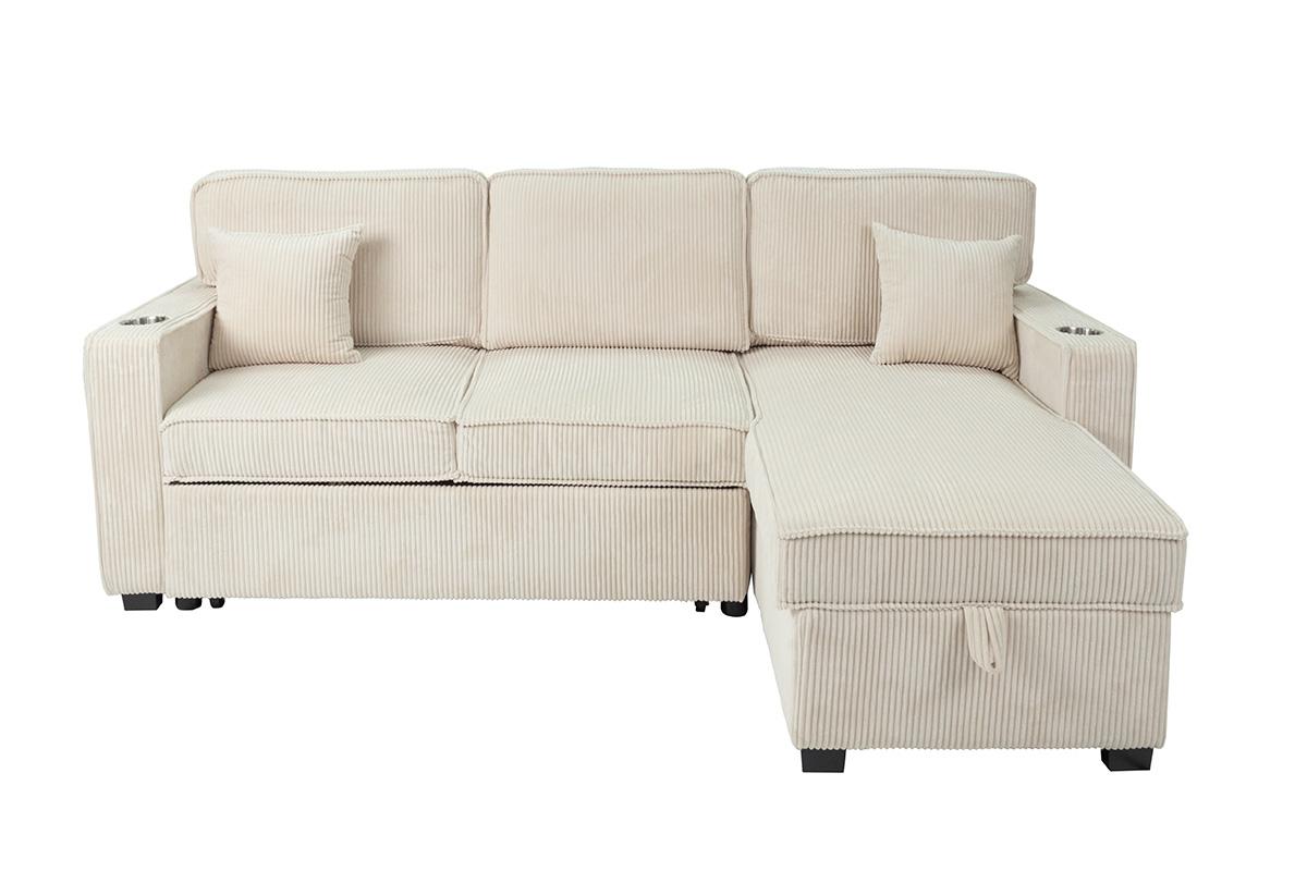 Enjoy the convenience of a multi-functional piece that adapts to your needs. Featuring a reversible chaise lounge, this sectional effortlessly adjusts to fit any living room configuration. The chaise base is reversible, ensuring flexibility in your setup. Hidden beneath the chaise is a spacious storage compartment, perfect for keeping throws, pillows, or other essentials neatly tucked away. Additionally, the chaise also features a cup holder within the arm to keep your drinks close at hand. The Left-Facing-Arm boasts a built-in USB port to keep your devices powered up. Whether you’re binge-watching your favorite shows or catching up on work, stay powered up and relaxed simultaneously. The sofa’s pull-out extension effortlessly converts into a bed, providing an extra sleeping space for guests or a cozy spot for movie nights. With two handles conveniently located in the front, transforming your sofa into a bed has never been easier. Upholstered in luxurious corduroy fabric, this sectional offers both style and comfort. The low-profile legs add a modern touch, while the two included throw pillows complete the look.