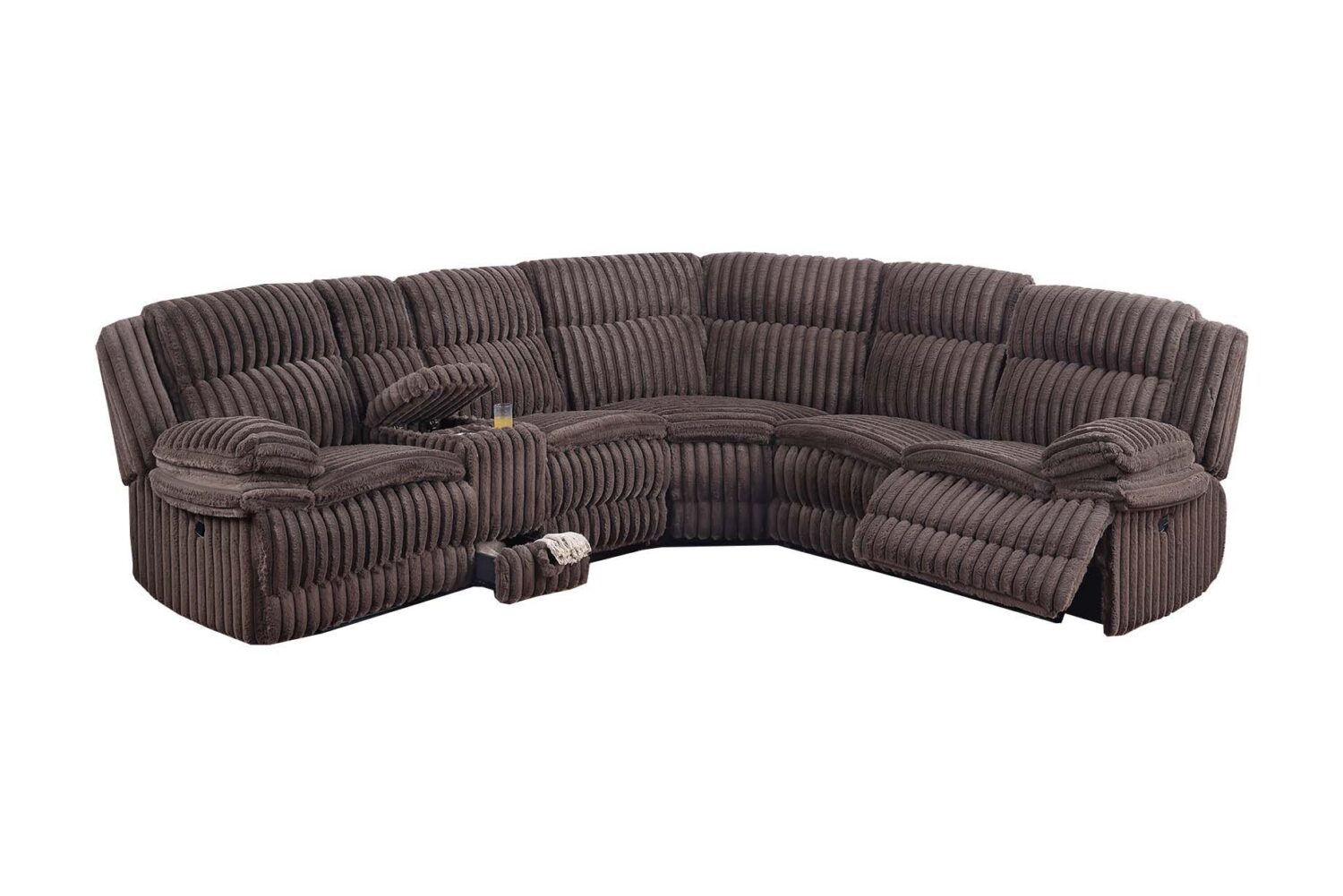 Designed to provide a cozy seating experience, this U-shaped sectional is upholstered in luxurious fur-like corduroy, offering a soft and inviting texture that complements its sleek design. The sectional is thoughtfully crafted with plush, thick armrests that cradle you in comfort while adding a touch of elegance to your living space. Both the left-arm-facing loveseat and right-arm-facing loveseat feature manual reclining mechanisms, conveniently located on the sides of the armrests. With just a simple pull of the handle, you can effortlessly recline into your ideal lounging position. The corner wedge completes the U-shaped design, providing ample seating space for family and friends to gather. The sectional includes a center console equipped with two cup holders, perfect for keeping your favorite beverages within reach during movie nights or relaxation time. The console also features a spacious storage compartment, ideal for stowing away remotes, magazines, or other essentials. Additionally, a small storage space at the base of the console adds extra convenience for organizing smaller items. Whether you’re entertaining guests or enjoying a quiet evening at home, this recliner sectional is designed to provide unmatched comfort and timeless appeal.
