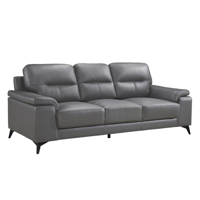 Styled for the modern home, the Mischa Collection’s sofa blends the luxurious feel of leather with the comfort of plush seating. The dark gray top grain leather cover, with faux leather, enhances the sleek profile of the collection. Contoured pillow-top arms and black metal legs further enhance the modern stance. Coordinating love seat and chair are available as well as an optional silver top grain leather cover with faux leather match.