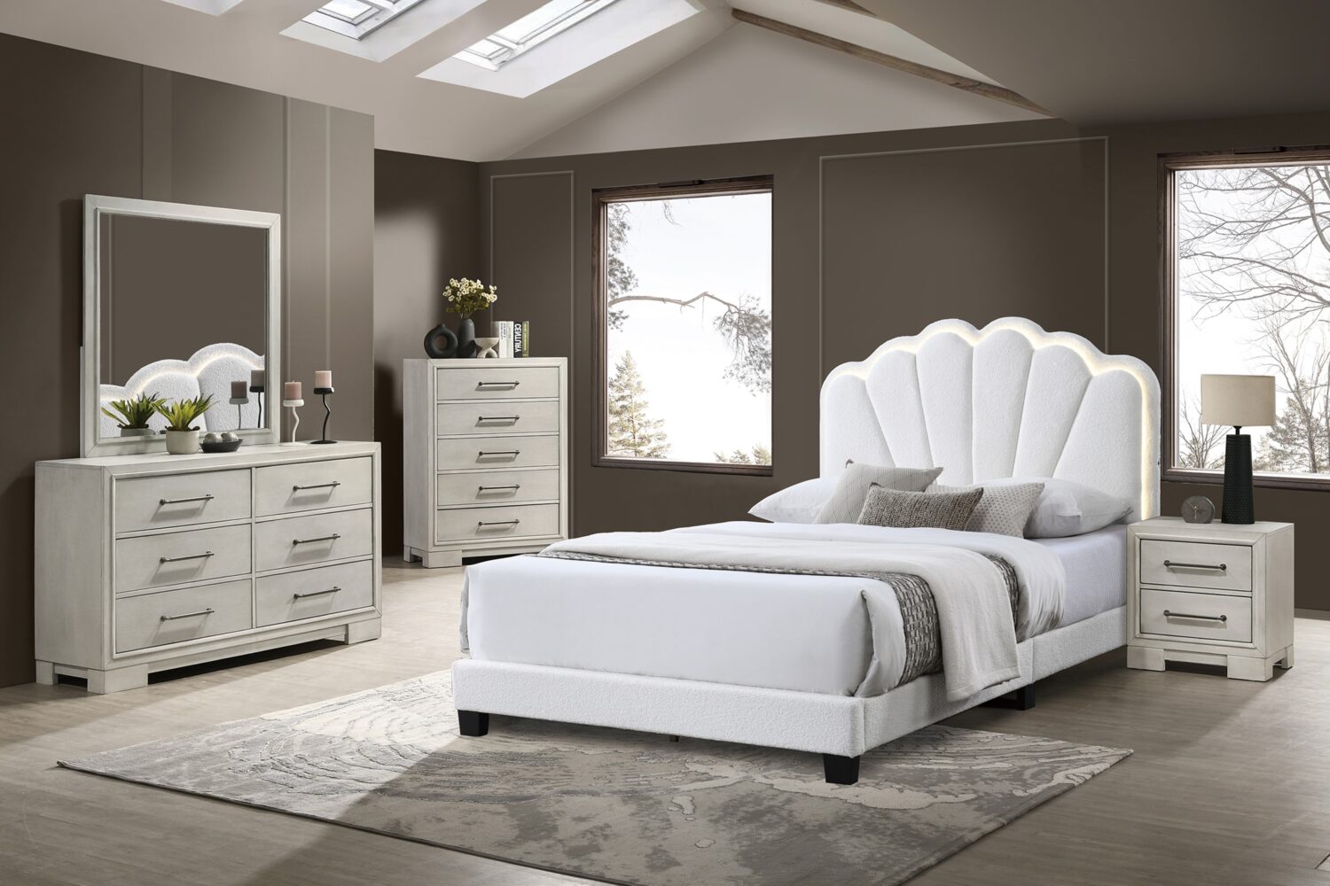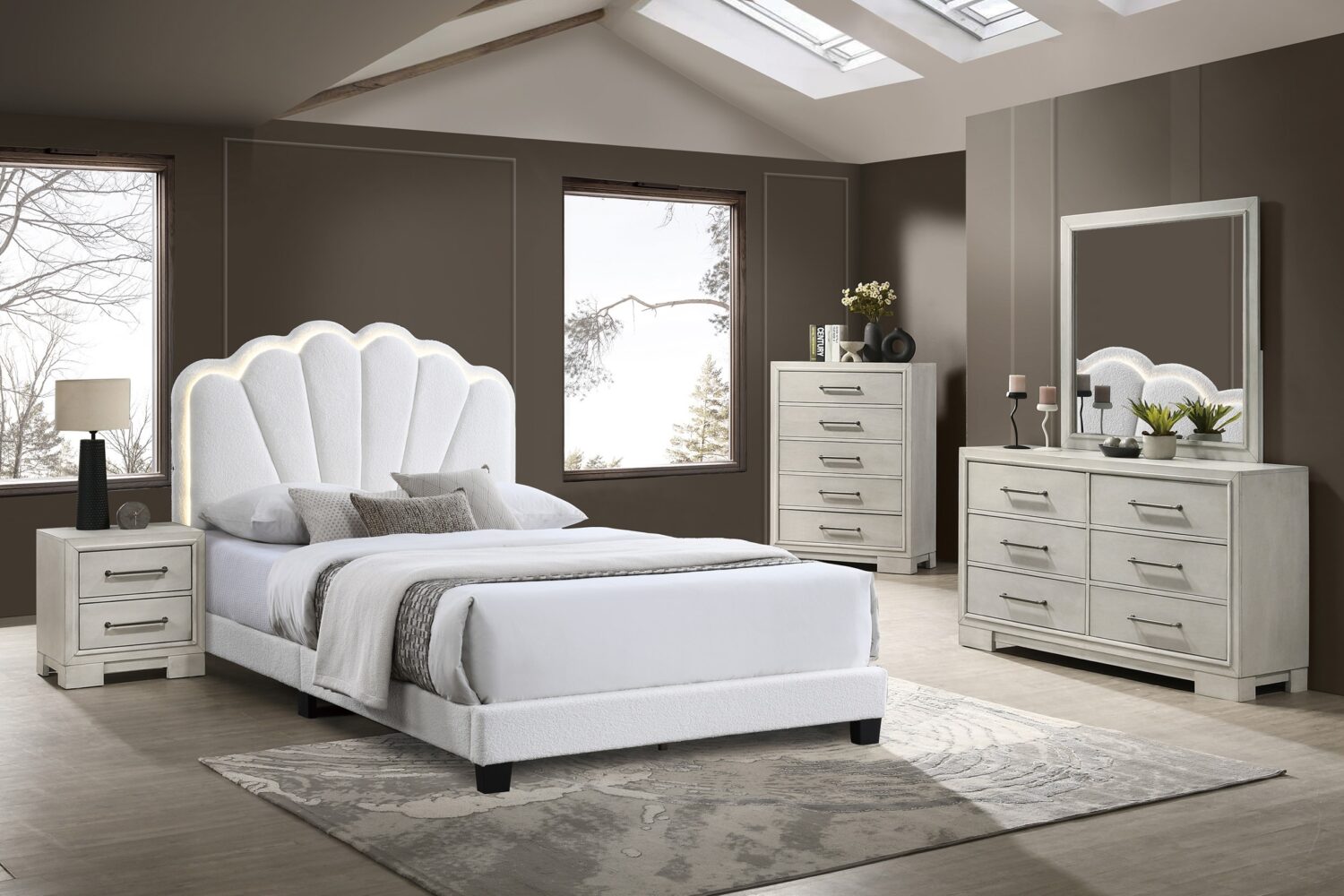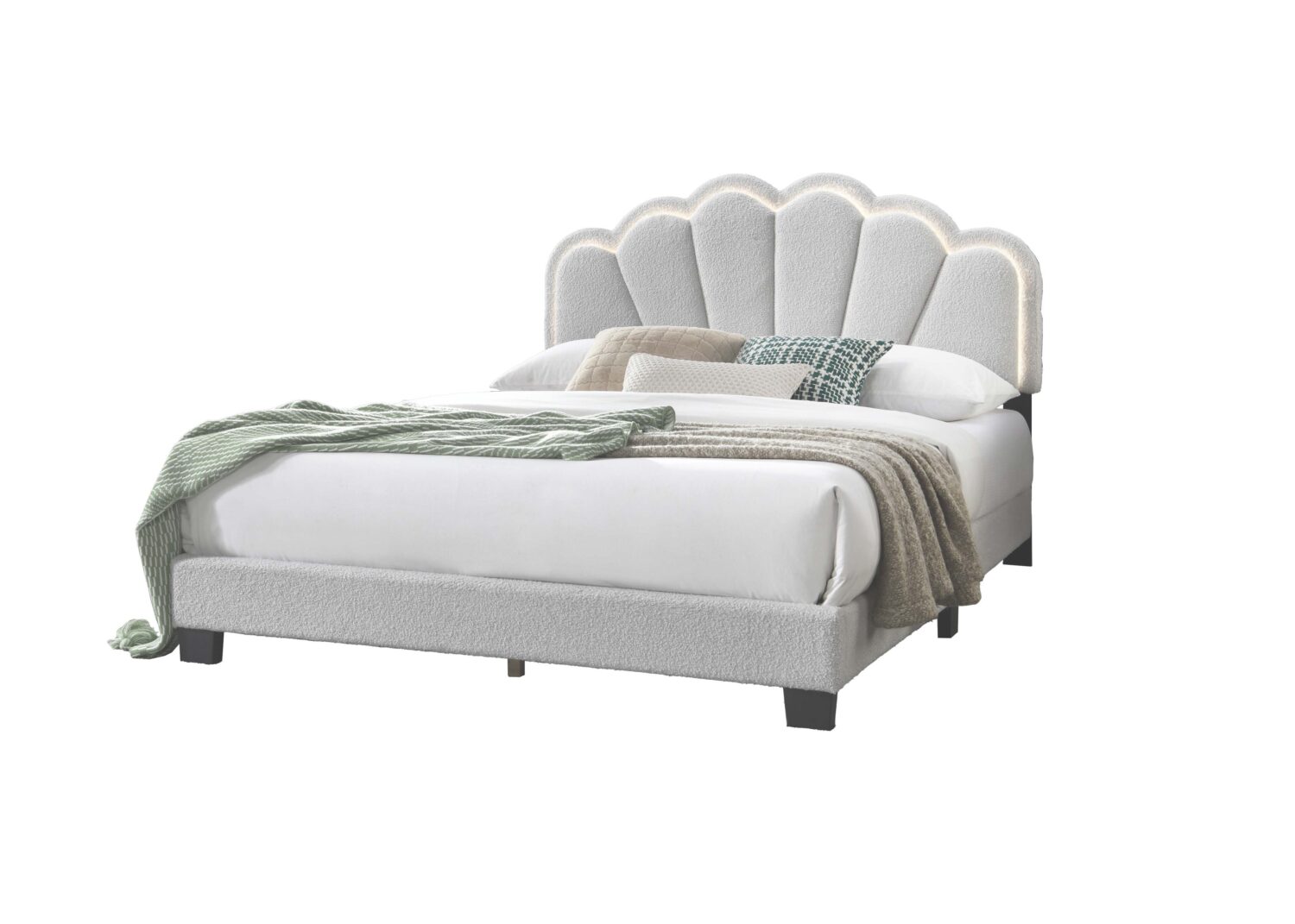 Designed without the need for a box spring, this platform bed ensures sturdy support and a sleek, low-profile look. Equipped with robust support legs, the bed guarantees stability, ensuring a good night’s sleep every night. The plush headboard is adorned with a delicate floral design that adds a touch of elegance and charm. The footboard complements the headboard while maintaining a streamlined appearance. The headboard features built-in LED lights, offering subtle, ambient lighting perfect for reading or creating a cozy atmosphere. Whether you are redesigning your bedroom or looking for a statement piece to enhance your space, this Queen Wool Fabric Platform Bed is the perfect choice.